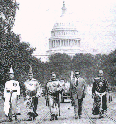 I recently came across the photo to the left, which purports to show Calvin Coolidge marching with several Klansmen in Washington. A look at several Klan websites revealed that the picture, Coolidge’s membership, or both were included on many. (See examples here and here.)